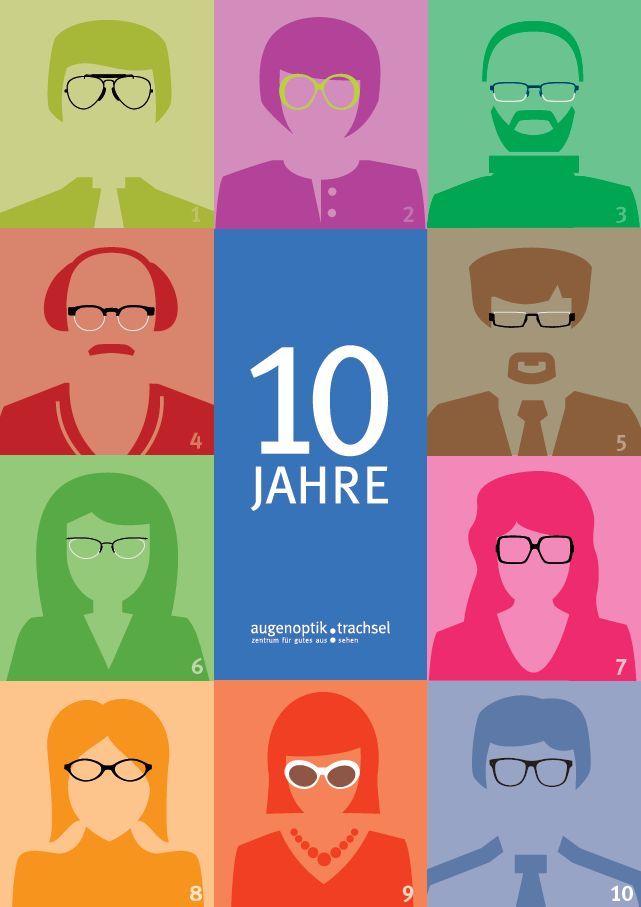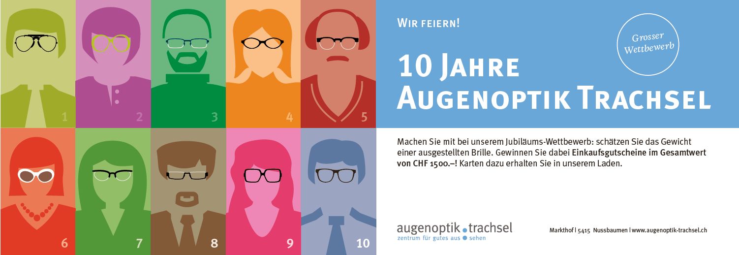 Seit der Eröffnung von Augenoptik Trachsel dürfen wir dieses erfolgreiche Unternehmen kommunikativ begleiten. 2014 feierte Augenoptik Trachsel bereits das zehnjährige Jubiläum. Ganz herzliche Gratulation. Auch diesen tollen Anlass durften wir kommunikativ und organisatorisch für den Event betreuen. 10 Jahre gut sehen und aussehen haben wir optisch mit eigenständigen, abstrakten Gesichtern umgesetzt. Diese dienten gleichzeitig als Schaufenster-Halter von aktuellen Brillen. Neben der Schaufensterdekoration wurden Plakate, Anzeigen, Medienarbeit und Wettbewerb durch uns umgesetzt. Wir freuen uns auf weitere 10 erfolgreiche Jahre der Zusammenarbeit!
