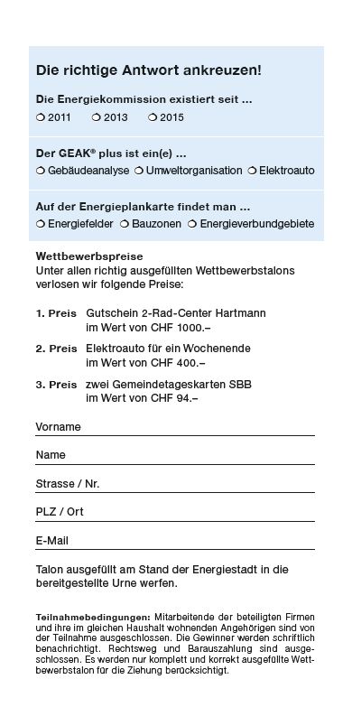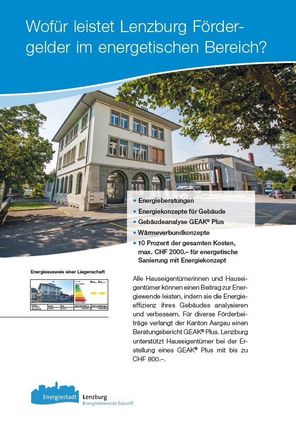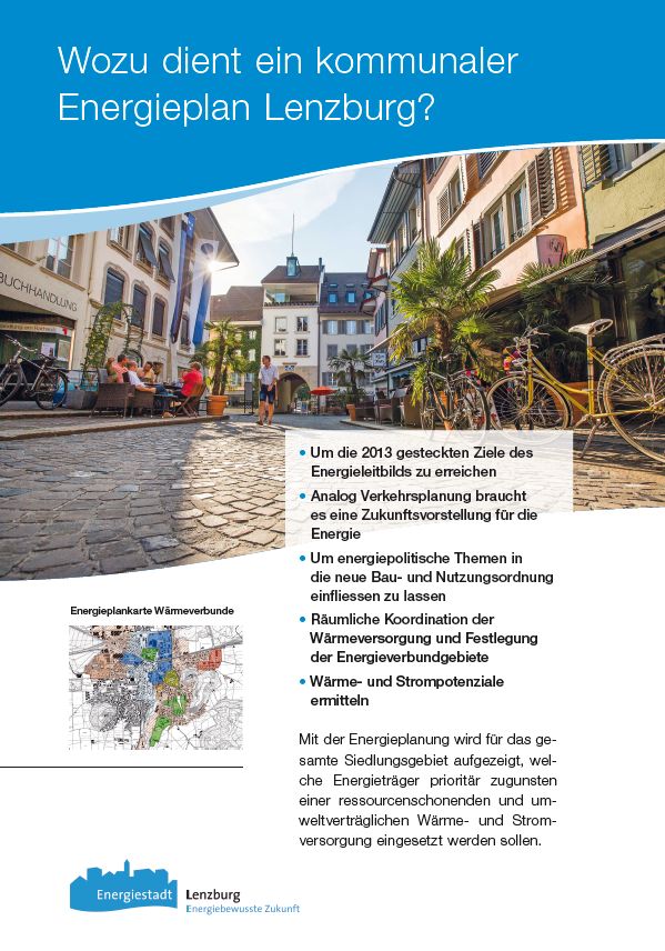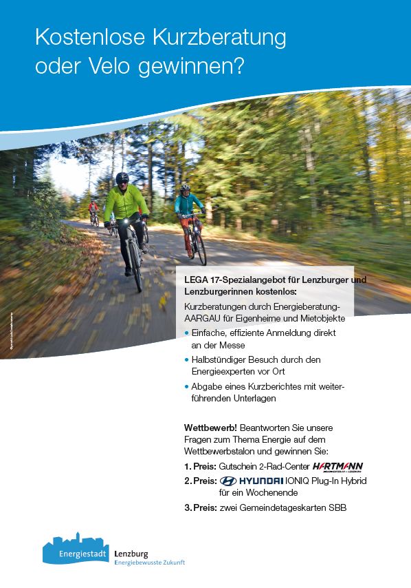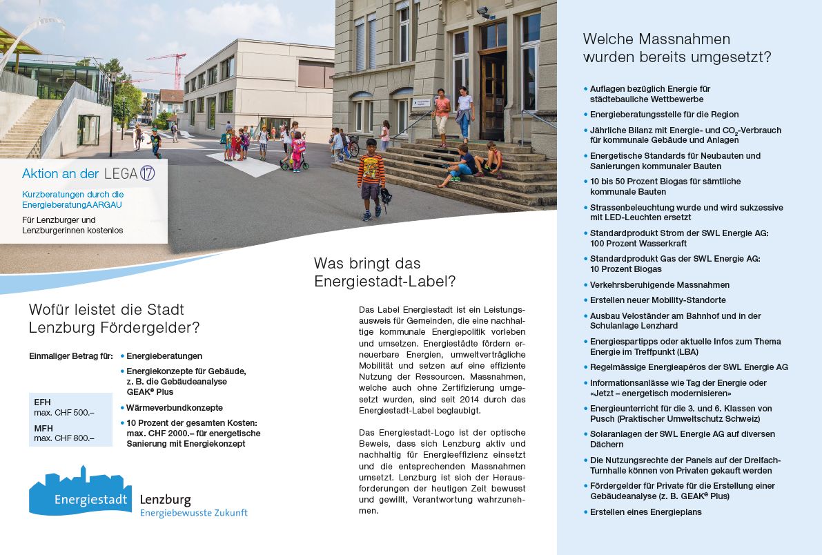 Aufgabe: Begleitung der Aktivitäten rund um den Stand an der LeGA17. Die Aufgabe bestand darin, das Angebot und die Dienstleistungen der Energiestadt Lenzburg einem interessierten Publikum nahe zu bringen. Daraus entstanden Informationsposter, ein Infoflyer und ein Wettbewerb.
