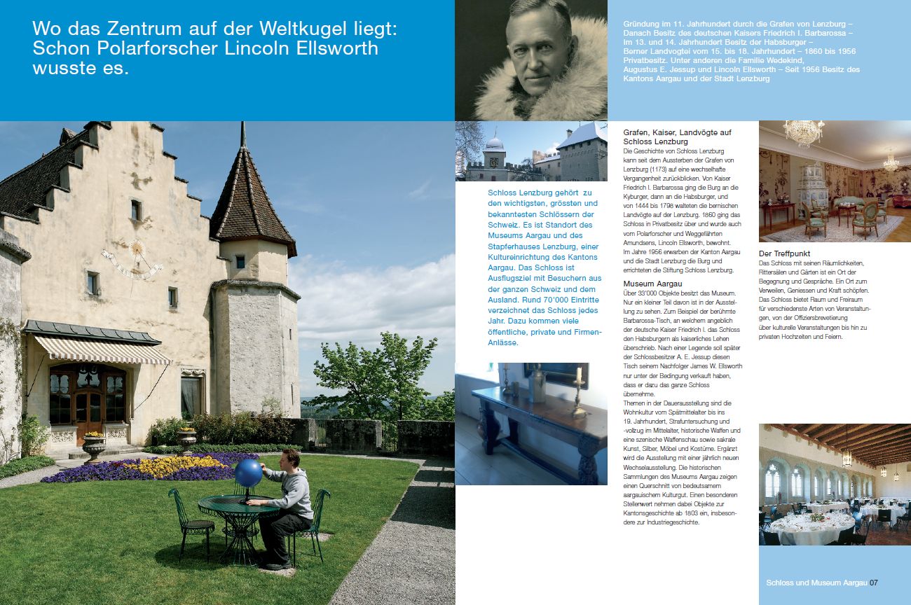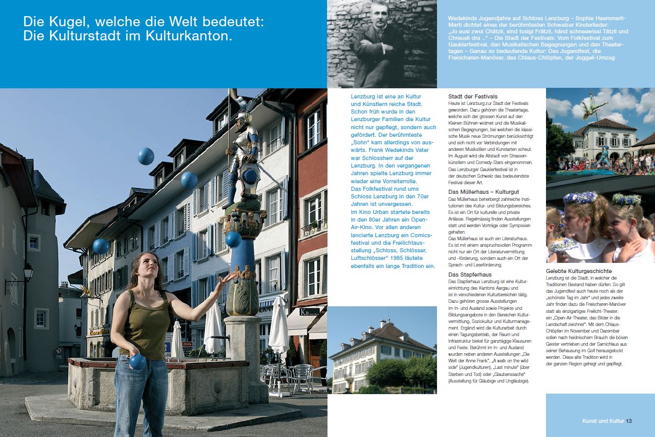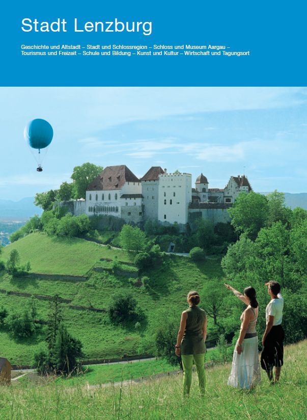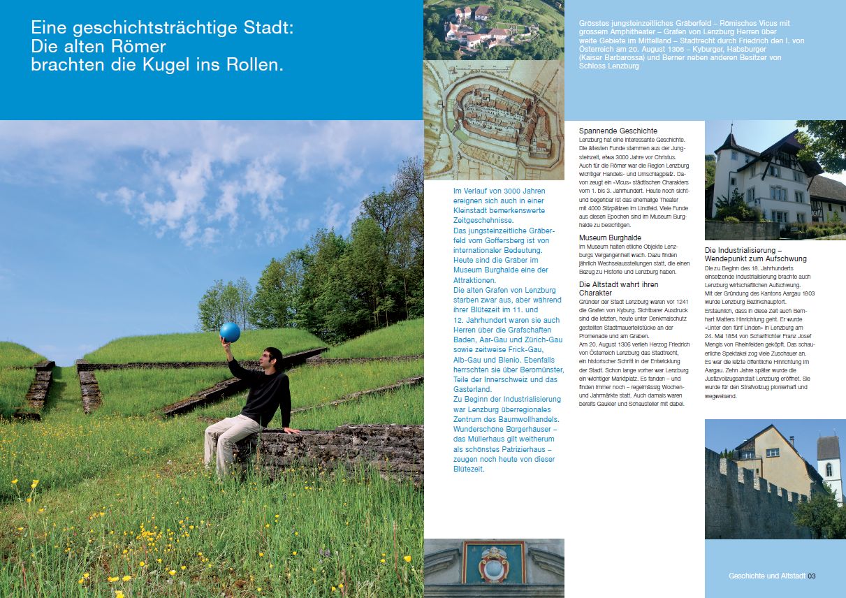 Die Idee: Das Wappen der Stadt Lenzburg ist eine blaue Kugel. Diese blaue Kugel kommt in der Broschüre auf sämtlichen Hauptbildern in irgend einer Form vor: Als Ballon, als Ball, als Globus und so weiter. Dadurch erreichen wir eine Alleinstellung für die Stadt, die unverwechselbar ist und nicht nachgeahmt werden kann.
