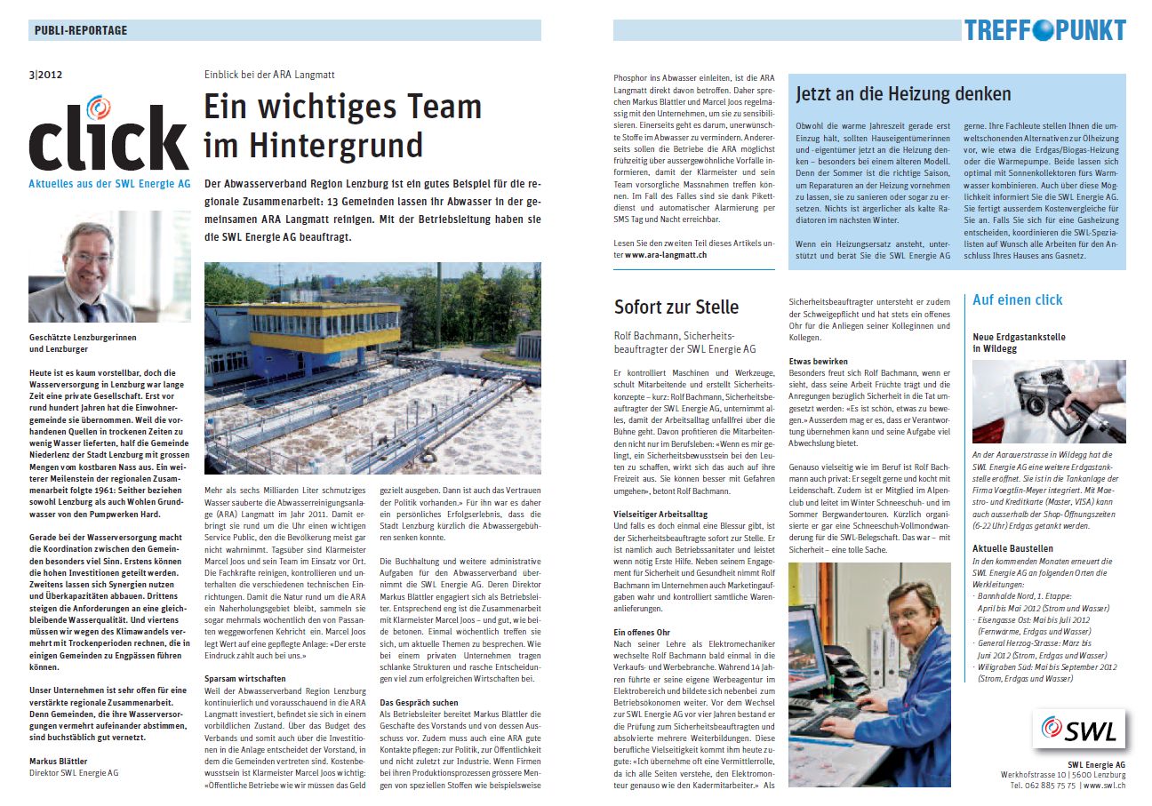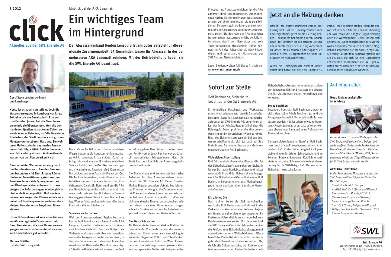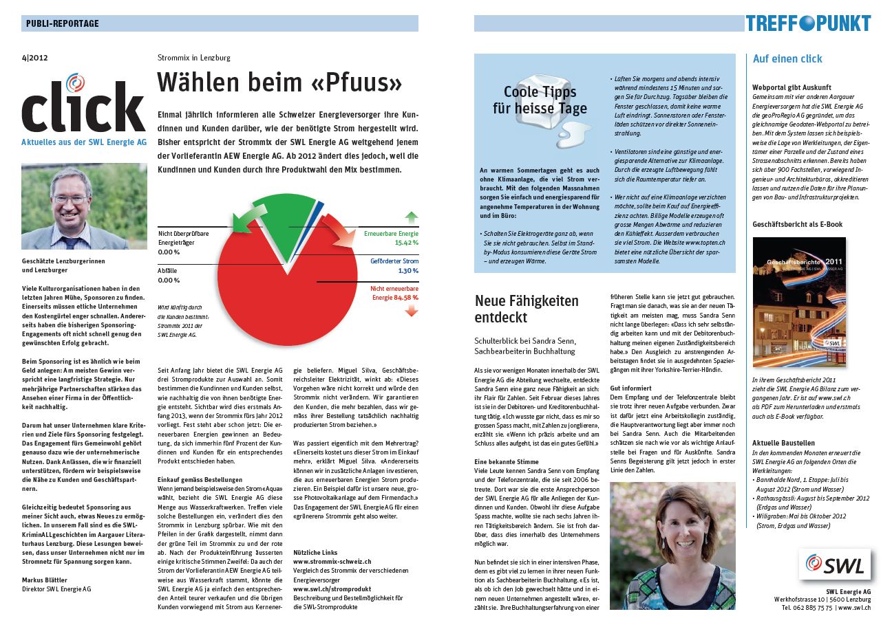 Für die SWL Energie AG erstellen wir alle zwei Monate die Kundeninformation. Diese Periodika wird einerseits den Kunden abgegeben und liegt andererseits der Zeitschrift "Treffpunkt Lenzburg" bei. Zudem haben wir für die SWL Energie AG Fahrzeugbeschriftungen und ein Orientierungssystem entwickelt.