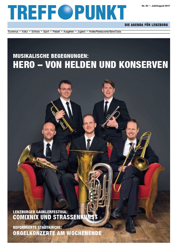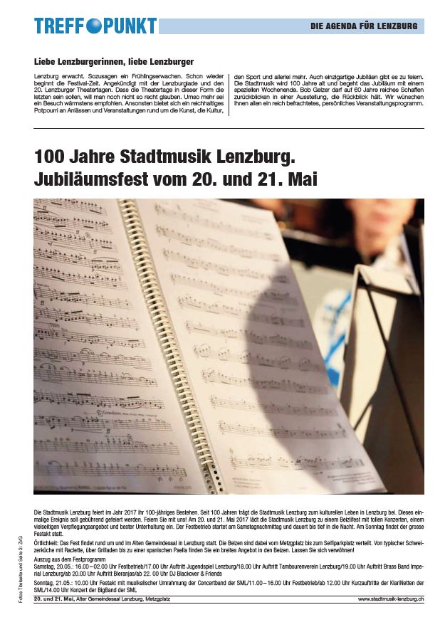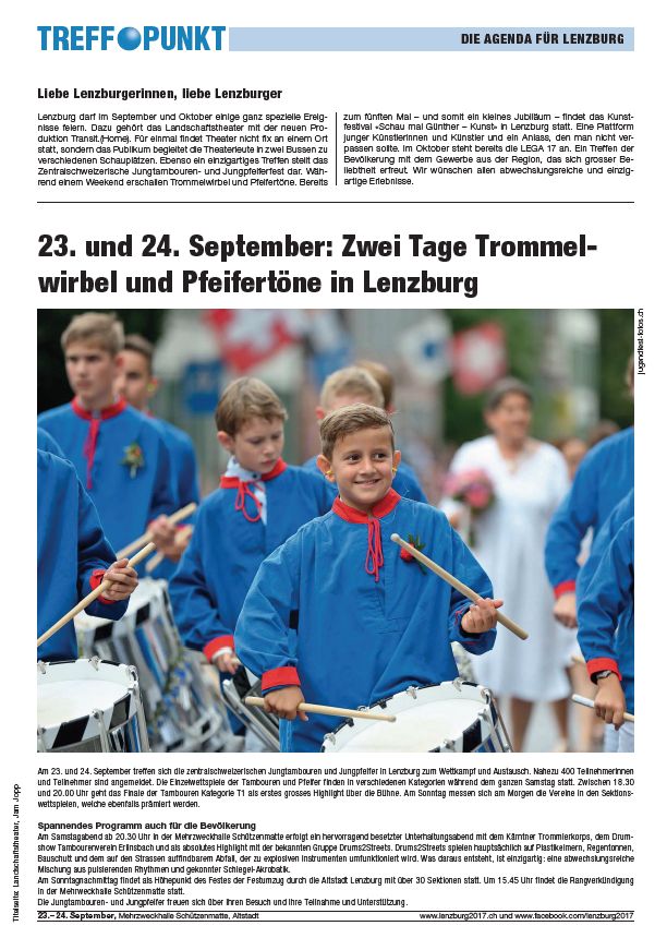 2013 lancierten wir mit der Stadt Lenzburg und Kromer AG den Treffpunkt mit vier Erscheinungen pro Jahr und 12 Seiten Umfang. Inzwischen hat sich der Treffpunkt zum unverzichtbaren Nachschlagwerk für alle Arten von Events entwickelt. Er erscheint 6x pro Jahr mit einem Umfang von 20 – 28 Seiten. Wir haben das Gestaltungs- und Inhaltskonzept entwickelt und setzen alle zwei Monate die neuste Ausgabe um.